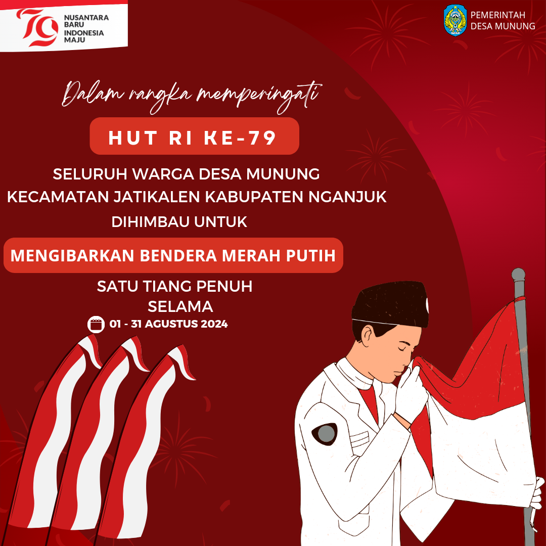 Memasuki bulan Agustus Pemdes Munung menghimbau kepada masyarakat agar memasang bendera Merah Putih. Hal ini untuk menyemarakan Hari Ulang Tahun (HUT) ke-79 Kemerdekaan Republik Indonesia (RI) pada 17 Agustus mendatang.